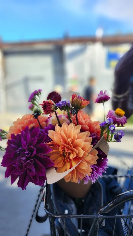 We sell our variety of seasonal flowers, offering fresh blooms for both wholesale and retail. We sell to florists, event planners, and businesses, while local customers enjoy hand-tied bouquets, subscriptions, and custom arrangements.